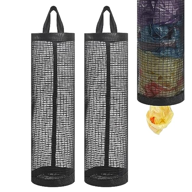 2 Pcs Plastic Bag Holder Trash Bags Storage Dispenser Organizer for Home Kitchen Mesh Hanging Storage Dispensers Recycling Garbage Folding Hanging Storage Bag Grocery Bags Holder with 2 Hooks (Black)