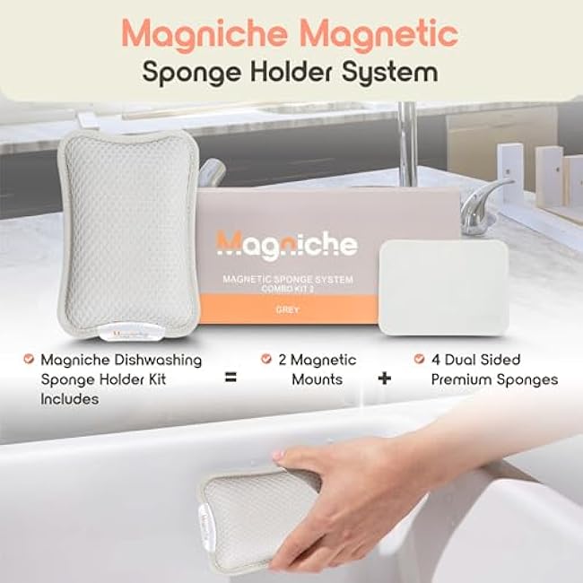 3-in-1 Dishwashing Cleaning Kit – Magnetic Sponge Holder for Kitchen Sink w/ 4-Pack Dual-Sided Dish Sponges Kitchen Set – Reusable Sponges for Dishes & Magnetic Dish Sponge System Starter Kit