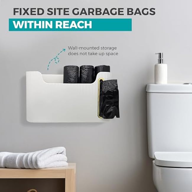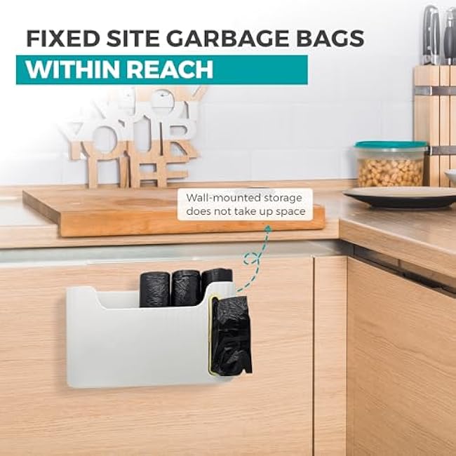 Trash Bag Holder Compact Design for Flat Surface, Comes with 3 Packs of 4-Gallon Easy-Seal Bags for Trash Bag Dispenser, Garbage Bag Holder with 3 Bag Clips, Garbage Bag Dispenser in White.